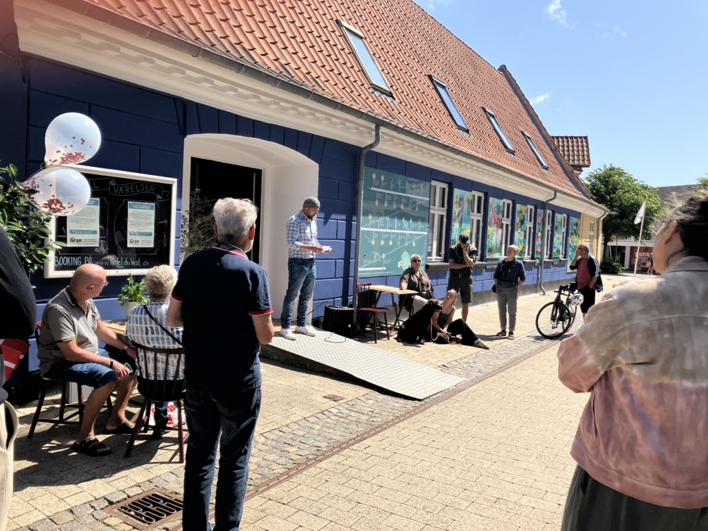 Der var højt humør og glade dage på Hotel du Vest i fredags, hvor der blev holdt fernisering for en ny frise på hotellets ydervæg. Kunstneren bag malerierne, Anders Schrøder, var mødt op til afsløringen og holdt tale om værkerne sammen med grundlægger af Gran Recovery and Health, Grete Mikkelsen.